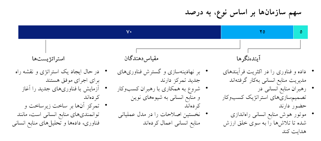 با پیشرفت سازمانها به سوی آیندهی مدیریت منابع انسانی، آنها در یکی از سه دسته قرار میگیرند.