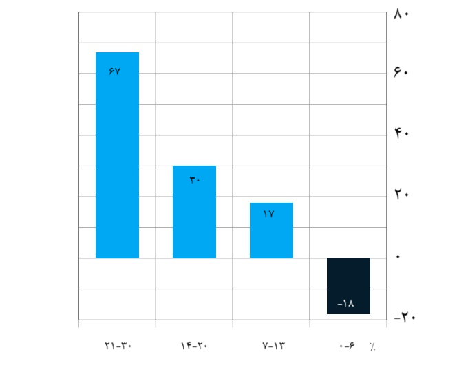 شرکتهایی با بازده مازاد مثبت برای سهامداران نسبت به شاخص صنعت، بر اساس درصد کارکنانی که مالکیت نقاط عطف یا ابتکارات تحول را بر عهده دارند، (تعداد = ۶۰ شرکت)